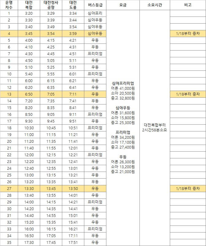 아래에 공유해드리는 대전 인천공항 리무진 시간표는 각각 대전복합, 대전청사공항, 대전도룡 정류장의 시간표입니다. 버스 등급은 심야프리미엄, 심야우등, 프리미엄, 우등으로 나뉘고 각각의 가격도 표시해 두었습니다. 대전복합 정류장부터 인천공항까지는 약 3시간 소요됩니다.