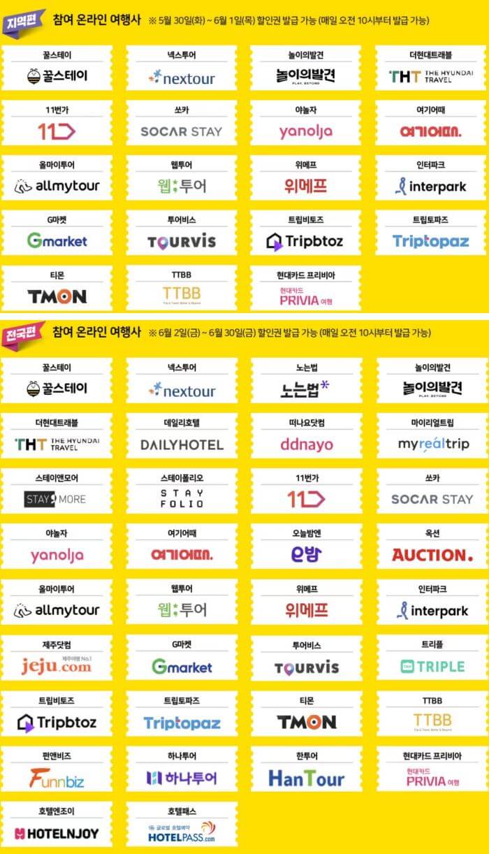 - 전국편 : 전국 어느 지역에서나 5만원 초과 숙박상품 구매 시 3만원 할인권을 제공합니다. 6. 2.(금)~6. 30.(금)에 온라인여행사 34개 채널에서 쿠폰이 발급되며 6. 2.(금)~7. 14.(금)의 기간에 쿠폰 사용이 가능합니다.