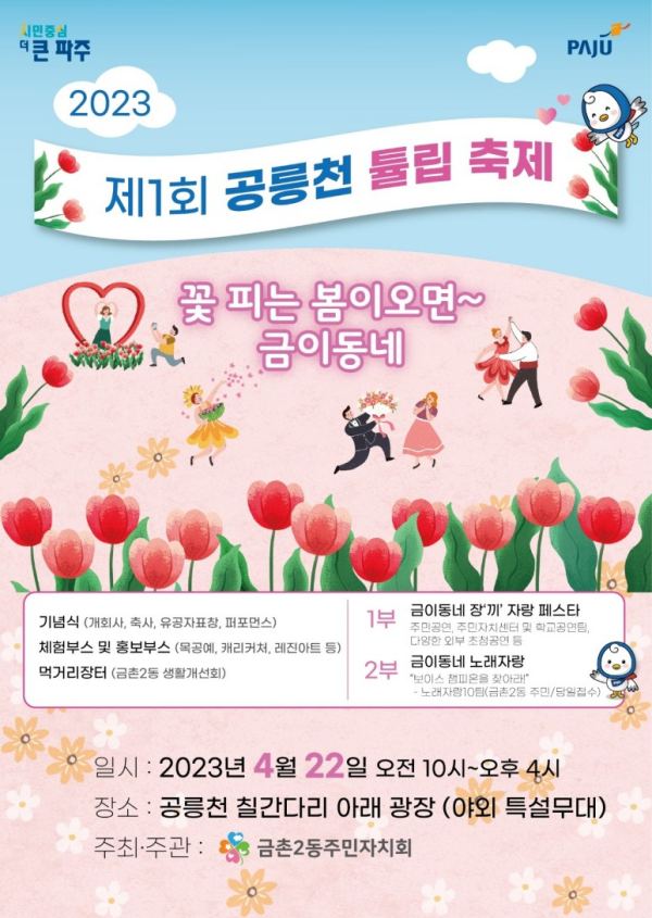 첫번째 튤립 명소 축제는 파주시 금촌동 금릉역 부근의 공릉천 튤립 명소입니다. 지금 튤립은 한창 피어나고 있습니다. 4월 22일 토요일에는 오전 10시부터 오후 4시까지 제1회 공릉천 튤립 축제도 개최될 예정입니다. 기념식, 체험부스 및 홍보부스, 먹거리장터, 공연 등이 계획되어 있습니다. 축제도 보고 튤립도 보면 좋겠습니다.