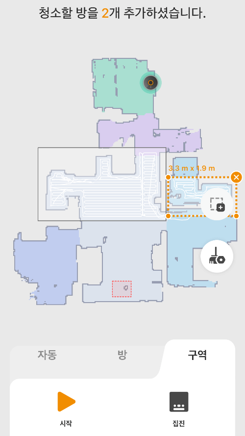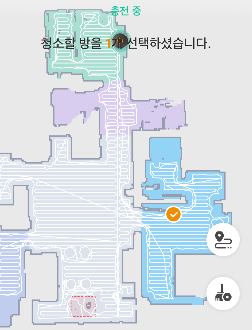 앱에서는 이렇게 가상 벽을 추가하거나 진입 금지 영역을 추가할 수도 있고요. 청소할 방을 일부 선택하거나(방은 제가 따로 지정하지 않았고, 알아서 스캔했습니다.) 구역을 설정해서 청소하고 싶은 부분만 청소할 수도 있습니다.