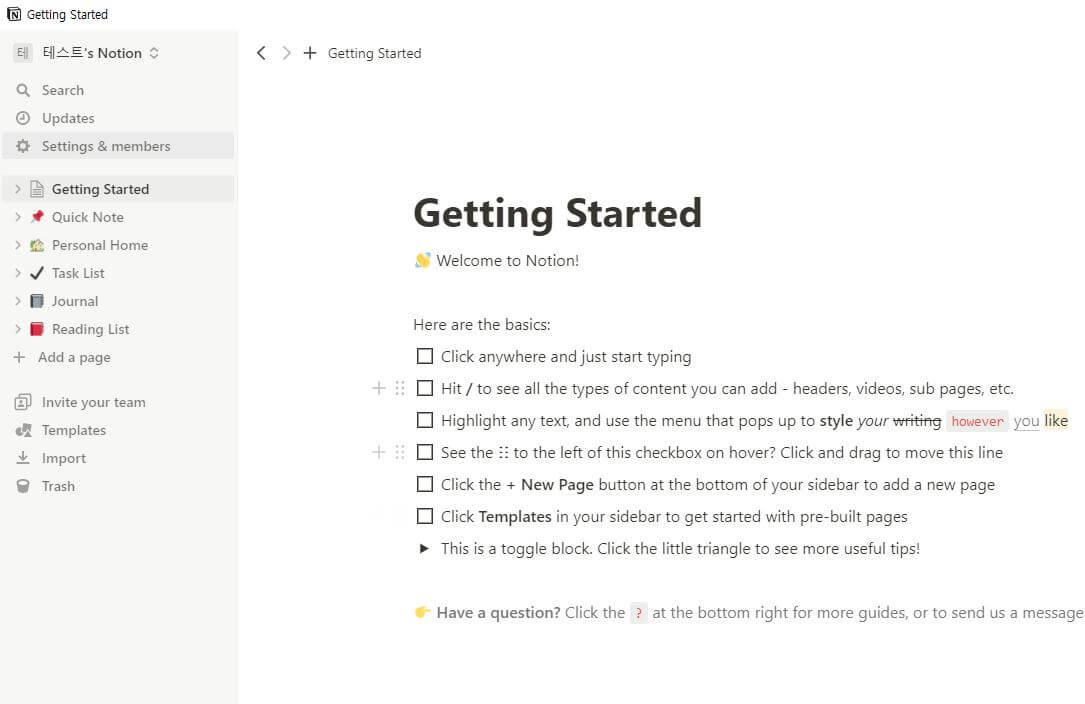 노션을 가입하고 나면 이렇게 첫 페이지가 뜹니다.